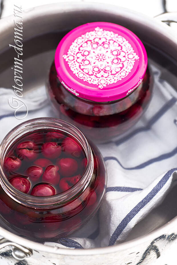 В кастрюлю влить воду, чтобы она доходила до плечиков банок (следить, чтобы вода не попадала в банки с вишней).
