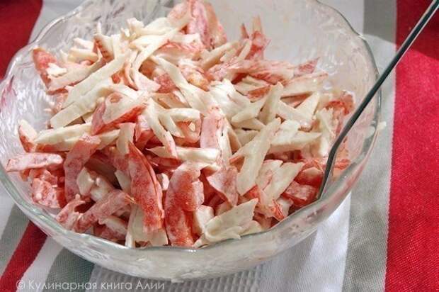 Нарежьте кубиками крабовые палочки. Выложите в салатницу.