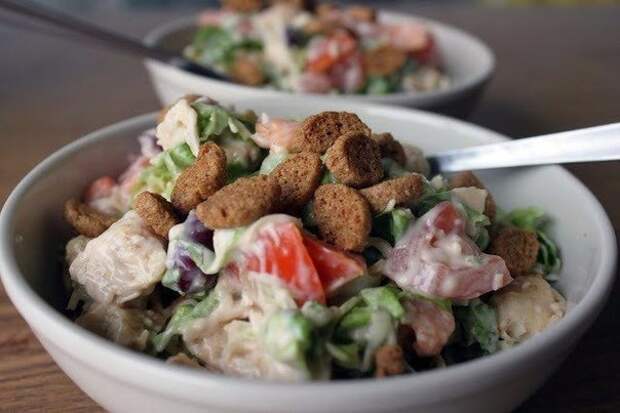 Салат "Цезарь" подаём свежеприготовленным, желательно пока мясо и сухарики не успели остыть.