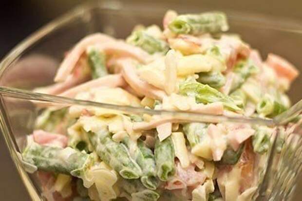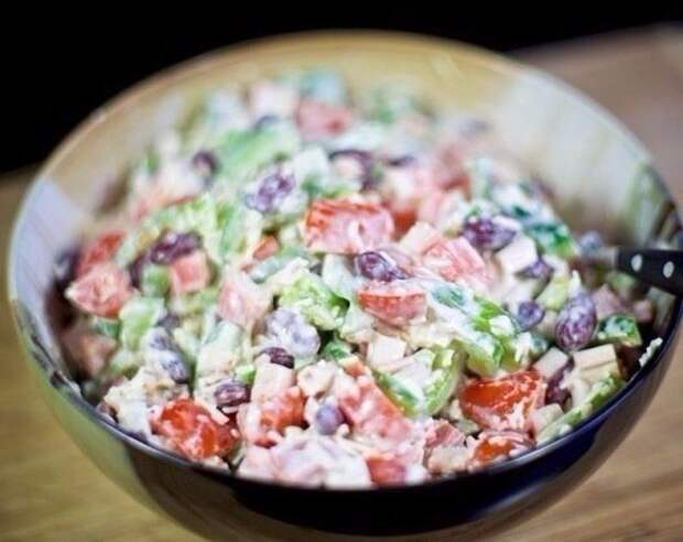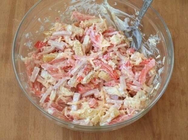 3. Смешиваем все нарезанные и готовые ингредиенты, заправляем майонезом (сметаной). Подаем салат, посыпав сверху сухариками.