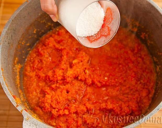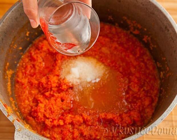 Затем выключаем огонь и добавляем: сахар + соль + уксус