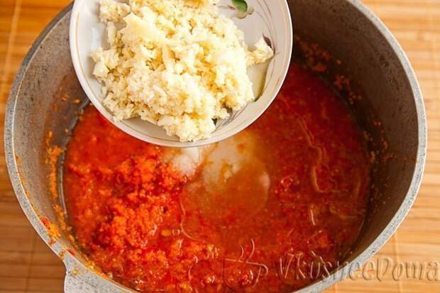 Чеснок, предварительно пропущенный через мясорубку добавляем в самом конце.