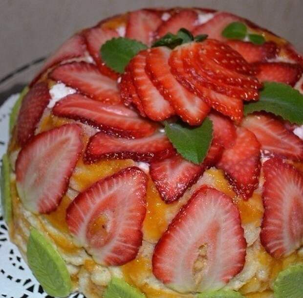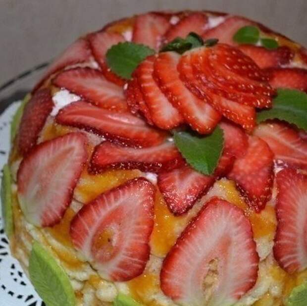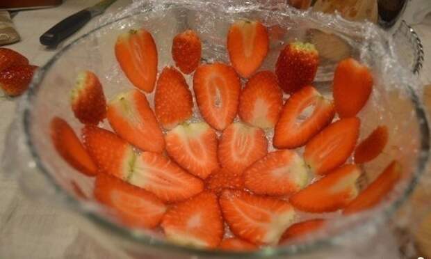 Готовим крем: Замочить желатин. Протереть через сито творог смешать с сахаром и йогуртом. Перемещать до полного растворения сахара. Добавить мелко нарезанную клубнику. Желатин растопить на водяной бане или в микроволновке 30 сек. Струйкой ввести в крем.Подготовка формы. Форму для торта (я брала миску для салата) укрыть пищевой пленкой. далее выложить клубнику.