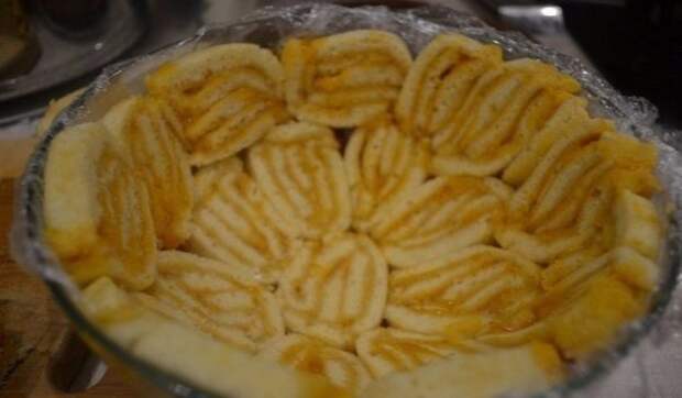 Нарезать рулетики и выложить сверху.Залить кремом и в конце уложить круглый бисквит. Убрать в холодильник до полного застывания.