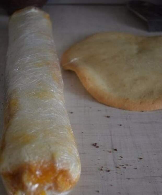 Разделить тесто на 2 части. Одно выложить на прямоугольный противень, для приготовления рулета. Другой выложить 2 круга размером формы для торта. Выпекать 8-10 мин. в разогретой духовке 180 гр. Далее достаем противень быстро смазываем джемом и заворачиваем в пищевую пленку. Оставляет в холодильнике на 15-20 мин.